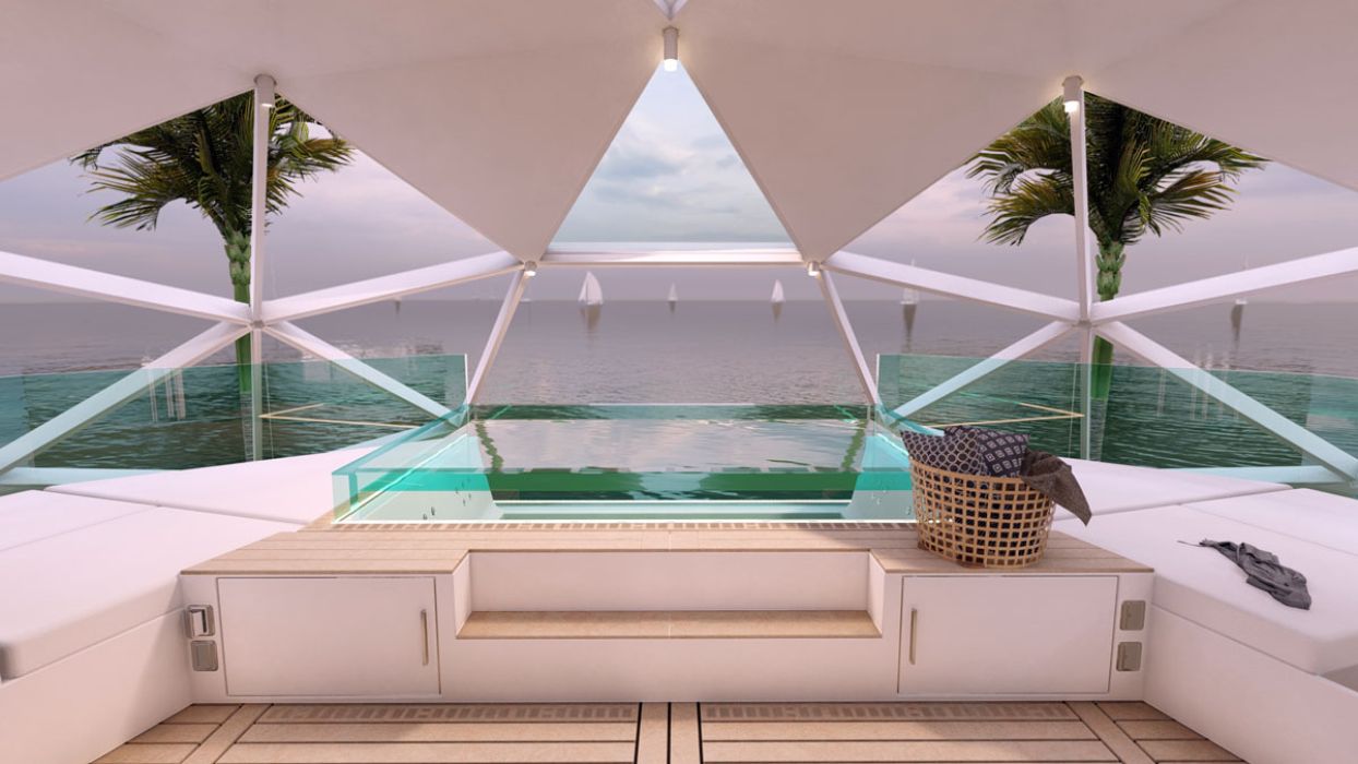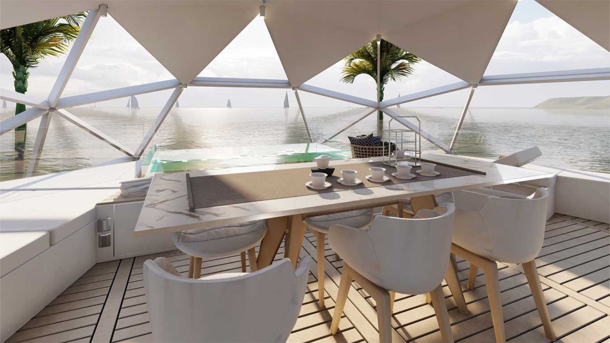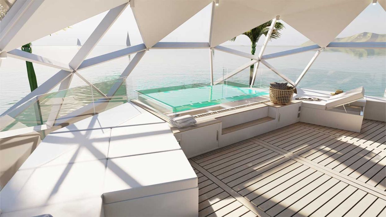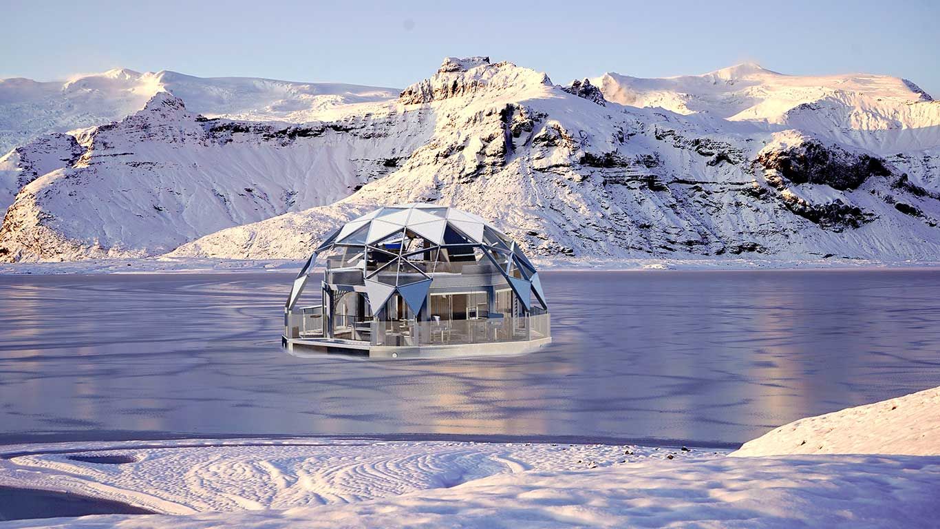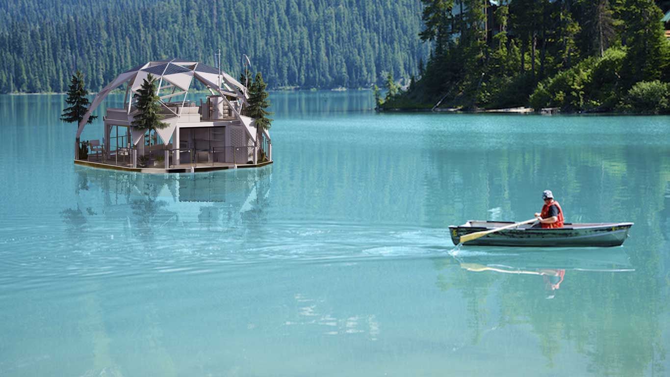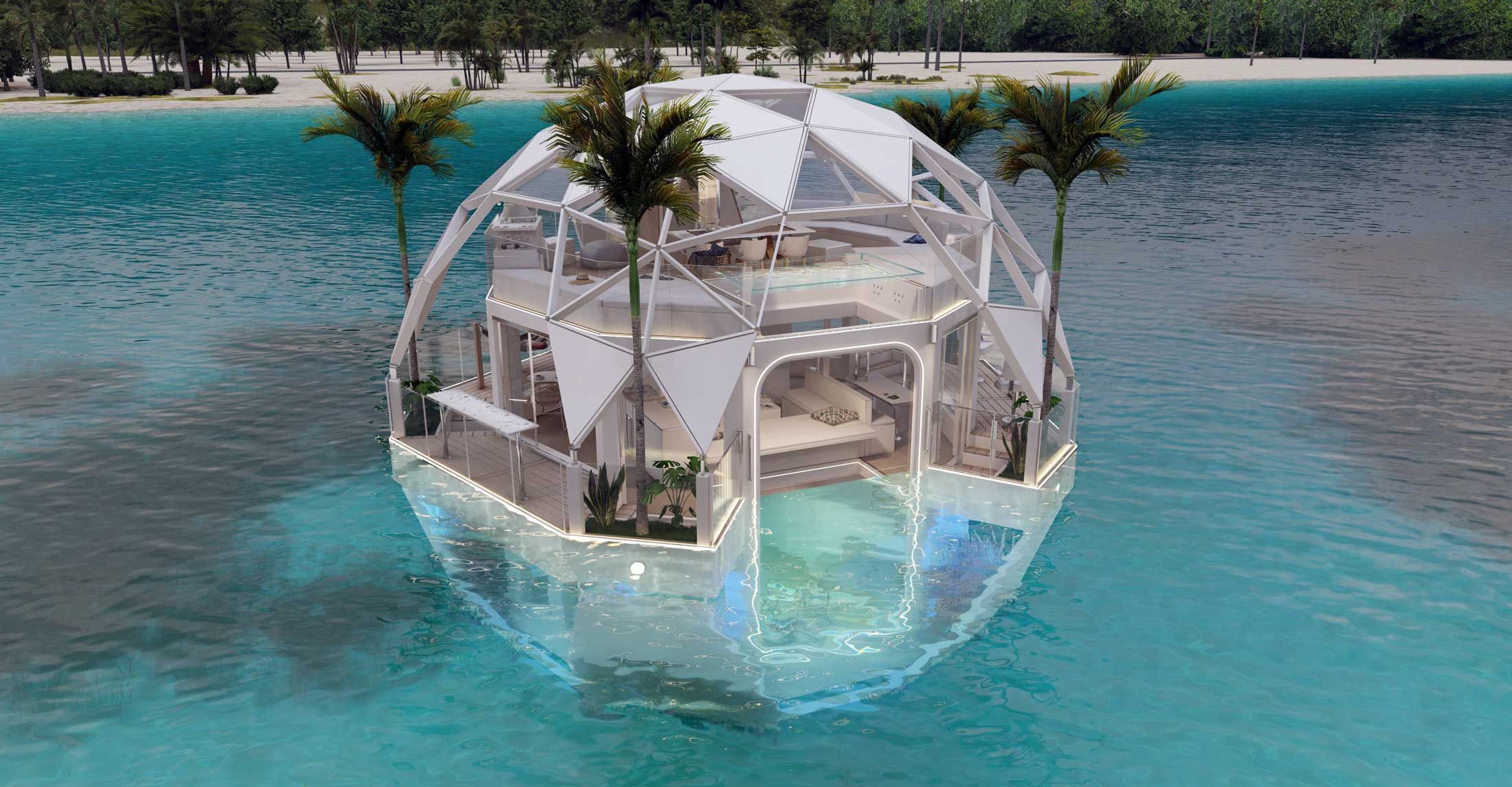 - Spherical houseboat provides 360-degree views for full immersion in nature.